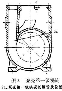 該灑水車泵雖然有兩個離心工作葉輪,但只有一個泵殼壓水室擴散管,一個泵殼氣液分離室,一個泵殼回流孔和一個泵殼儲液室。泵殼氣液分離室位于泵殼的上部。泵殼儲液室位于泵殼的下部。泵殼的回流孔設計于泵殼二級渦殼處,位于泵殼二級隔舌頂端起點的192度處。它將泵殼儲液室和泵殼二級渦殼連通。泵殼壓水室擴散針與泵殼二級渦流道出口連通,位于泵殼上方的中間部位。
